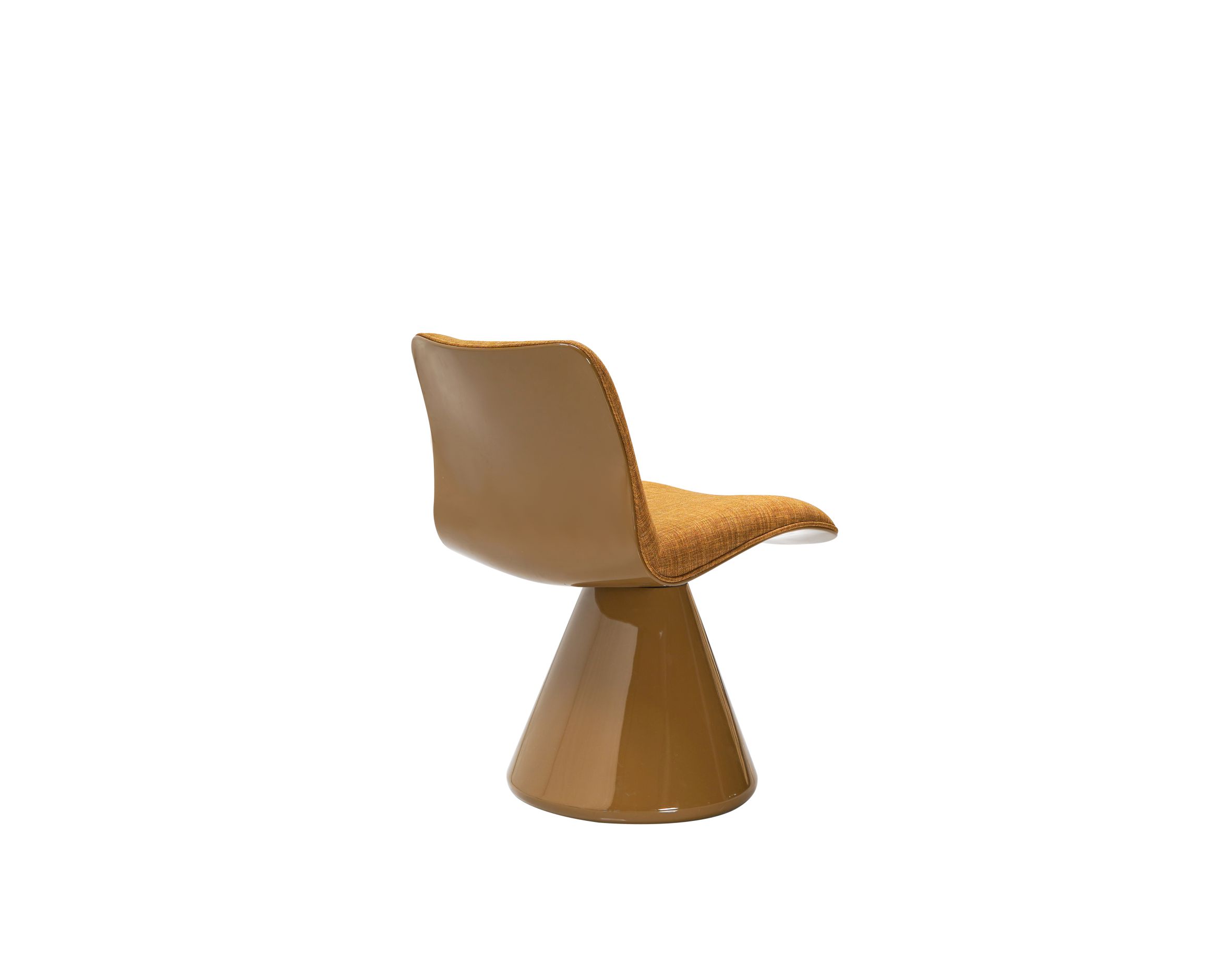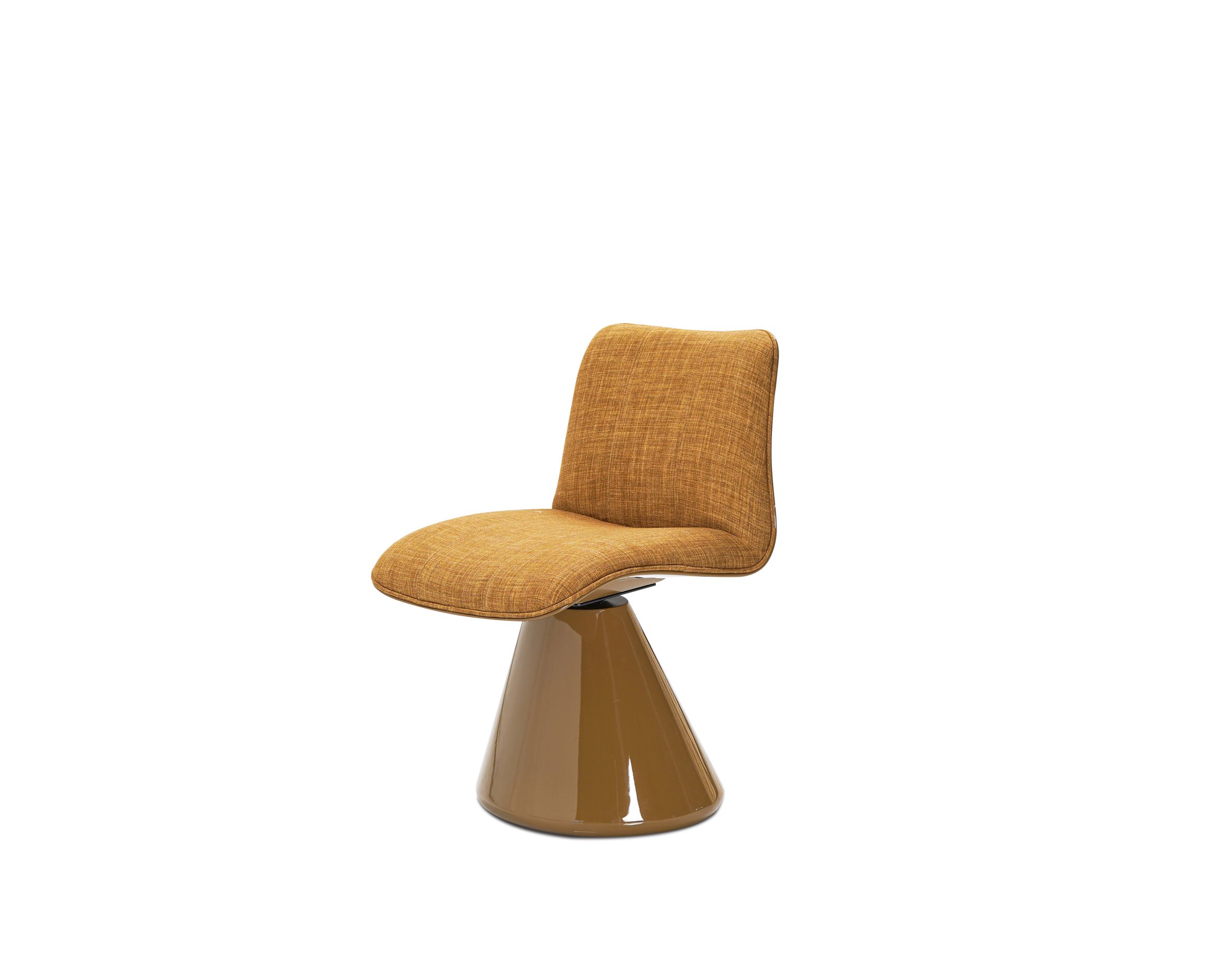 旋转功能被巧妙整合在结构中,转动顺滑且不破坏视觉的整体感。底座可选择高光或哑光涂装,与环境光线互动;座面部分可根据使用场景自由选择不同面料,但整体气质始终保持克制与精致。